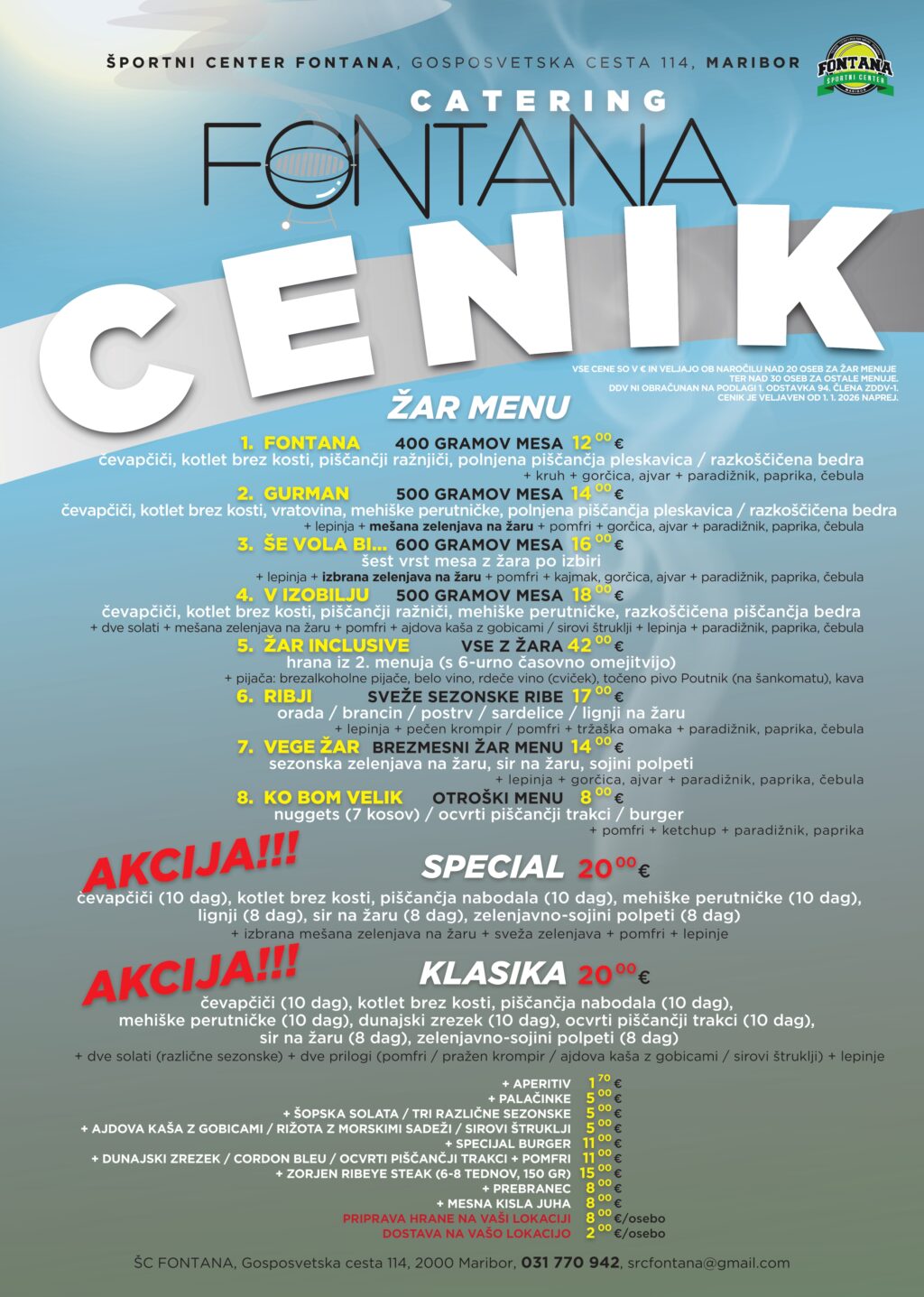 Čevapčiči (10 dag), kotlet brez kosti, piščančja nabodala (10 dag), mehiške perutničke (10 dag), dunajski zrezek (10 dag), ocvrti piščančji trakci (10 dag), sir na žaru (8 dag), zelenjavno – sojini popeti (8 dag)